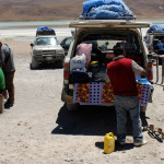Nachdem sich alle Vehikel vor uns bereits auf den Weg gemacht haben, verlassen auch wir die Stadt Richtung bolivianischem Grenzposten. Eine Stunde geht es durch die Wüste den Berg hinauf, bis wir an eine „Kreuzung“ kommen, die rechts geteert Richtung Argentinien geht und links, nicht wirklich zu erkennen, querfeldein nach Bolivien abbiegt. Der Fahrer entschließt sich für die Schotterpiste und keine 10 min später sehen wir schon das Grenzhäuschen. Hier steht auch schon unser 4×4 Gefährt bereit: ein weinroter Toyota Range Cruizer, quasi der Urvater aller Sports Utility Vehikel von heute. Ein kleines Frühstück wird serviert, während jede Gruppe der Karawane sich in ihrem Tempo die Einreisestempel holt. Felix, unser bolivianischer Fahrer, steht schon auf dem Autodach bereit und versucht uns wild gestikulierend klarzumachen, dass wir doch schon mal unsere Rucksäcke zu ihm hochwerfen sollen. – gar nicht so einfach bei 18 kg. – Das Gepäck wird mit einer blauen Abdeckplane ummantelt und am Dach festgeknotet.
